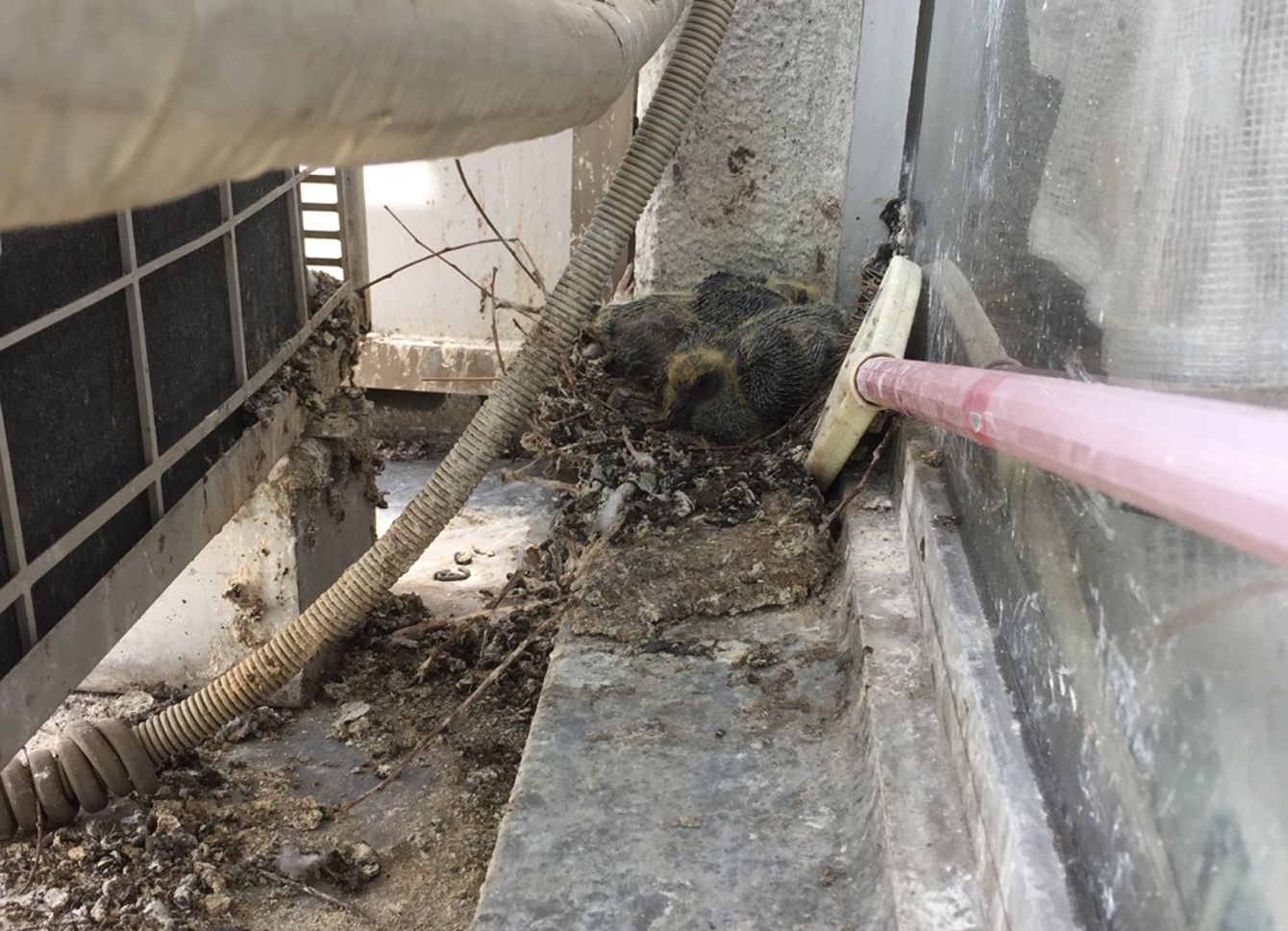 マンションのベランダ室外機裏に鳩が巣をつくっていた。2羽のひなは保護された。