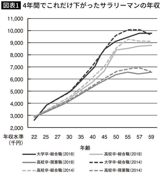 ※労務行政研究所編 「モデル賃金・年収と昇給・賞与」(全産業規模計)2015年版および2019年版を基に筆者作成。
