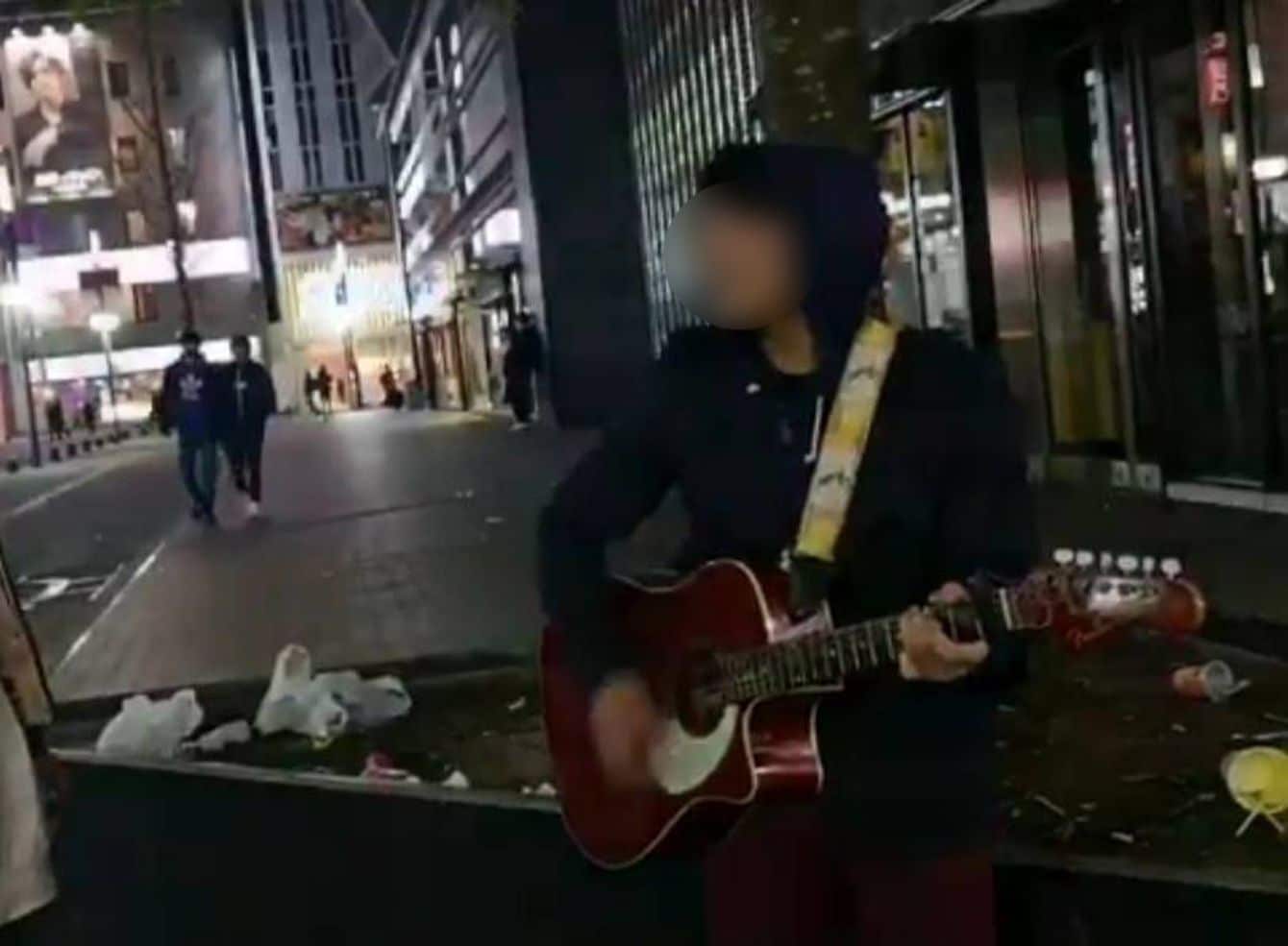 深夜の歌舞伎町で弾き語りをするAさんの様子。4カ月続けた結果、路上に集う若者のほとんどと知り合いになったそうだ。