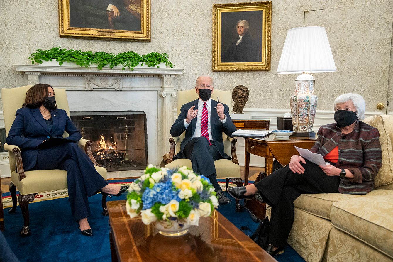 アメリカのジョー・バイデン大統領(中央)、カマラ・ハリス副大統領(左)、ジャネット・イエレン財務長官(右)=2021年1月29日、ワシントンD.C.のホワイトハウス大統領執務室
