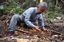 遺骨を探す具志堅隆松さん。小さな破片を見極めるため、75年間積もった腐葉土を素手で掘り起こす=2020年12月8日、沖縄県糸満市
