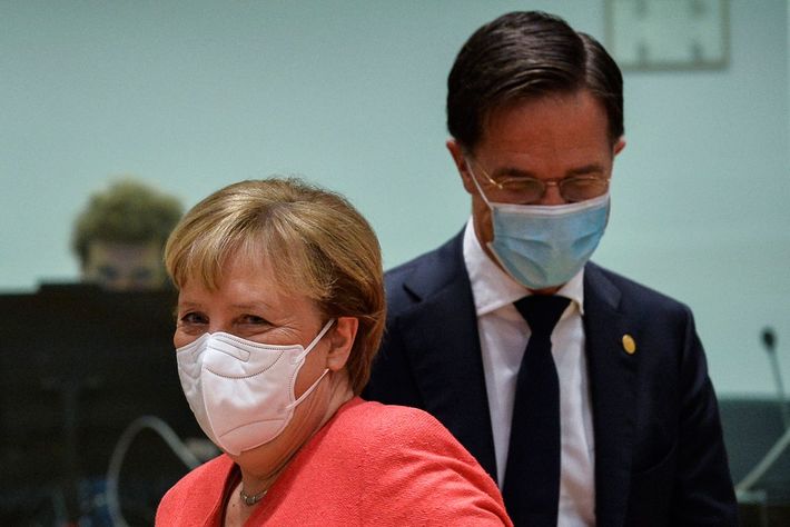 ブリュッセルで開かれた欧州連合(EU)首脳会議に出席するドイツのアンゲラ・メルケル首相(左)とオランダのマルク・ルッテ首相(右)=2020年10月2日