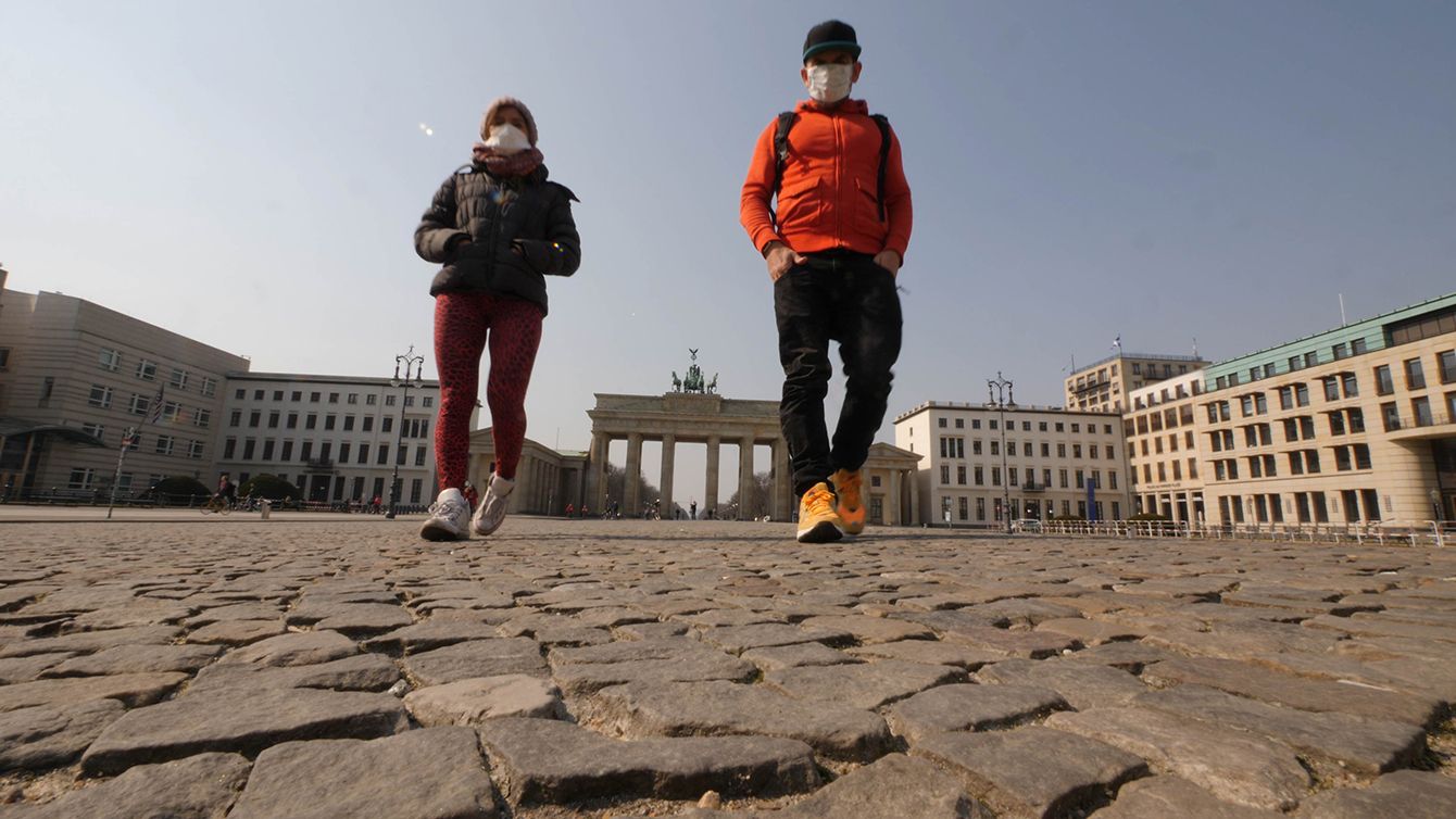 ブリュッセルで開かれた欧州連合(EU)首脳会議に出席するドイツのアンゲラ・メルケル首相(左)とオランダのマルク・ルッテ首相(右)=2020年10月2日