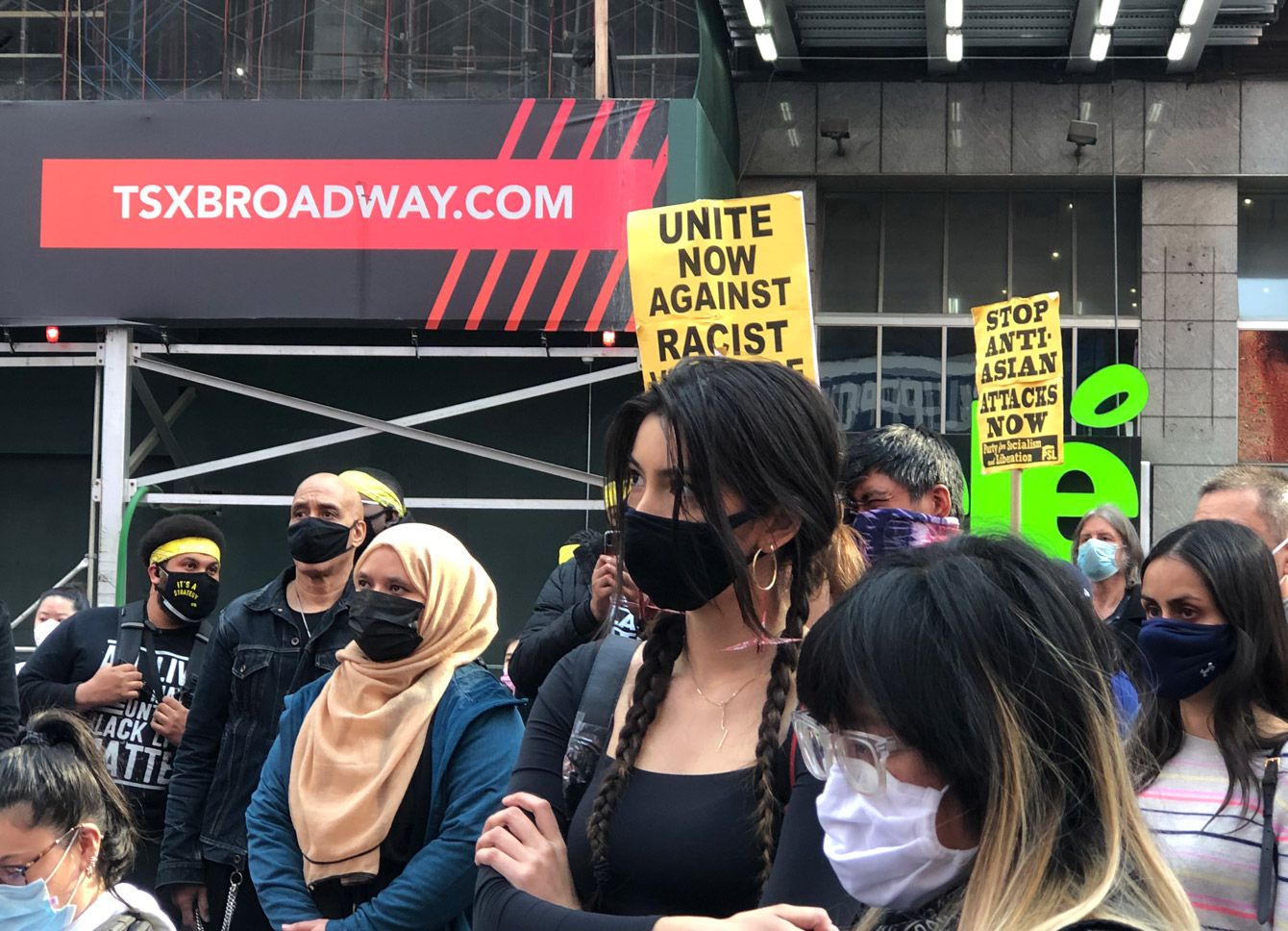 ニューヨーク・タイムズスクエアで行われたアジア系差別に対する抗議デモ=2021年4月4日