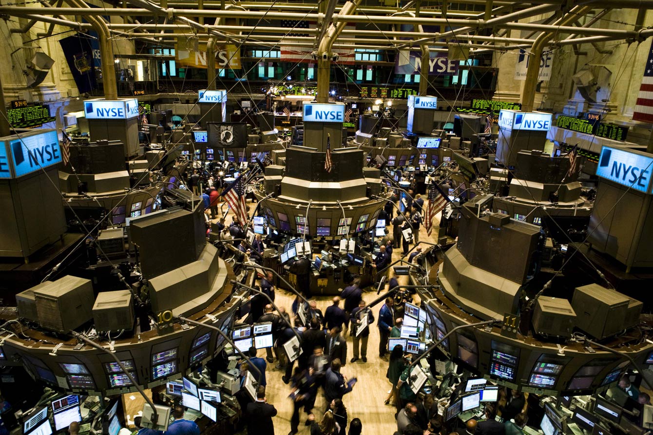 2008年9月15日、米証券大手リーマン・ブラザーズの経営破綻から一夜明けたニューヨーク・ウォール街の証券取引所の取引場。ダウ平均は前週末終値比504.48ドル(4.4%)安の1万0917.51ドルと2006年7月以来の安値引け(アメリカ・ニューヨーク)
