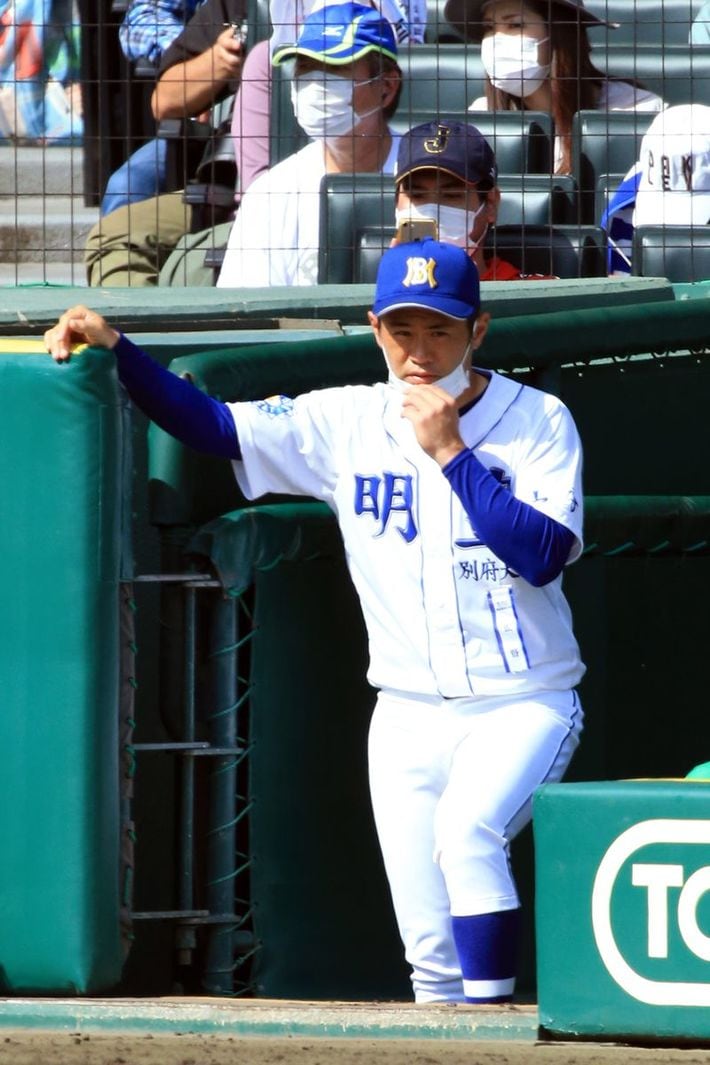 明豊の川崎絢平監督。2021年4月1日、甲子園球場で行われた第93回全国高等学校野球選抜大会決勝戦、明豊(大分)は東海大相模(神奈川)に2-3のサヨナラ負けで準優勝に終わった。