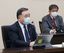 半導体サプライチェーン(供給網)強化を話し合う産学検討会の初会合であいさつする梶山弘志経済産業相(左)=2021年3月24日、東京都千代田区