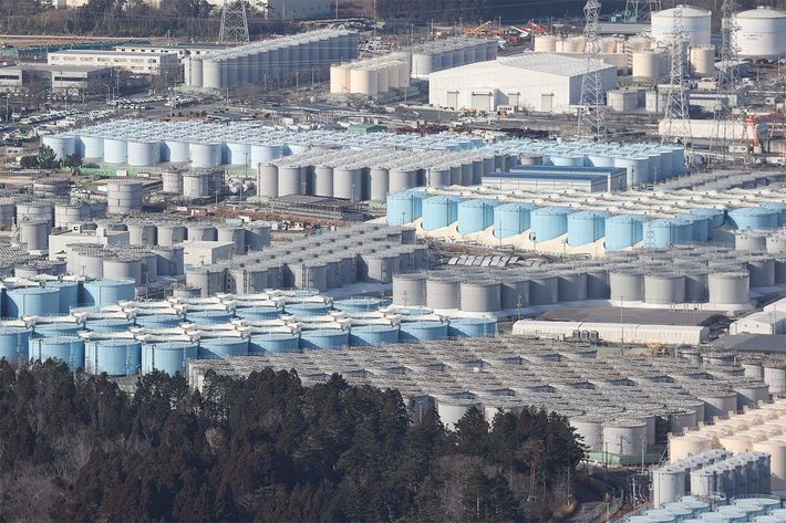 廃炉作業が進められている東京電力福島第1原子力発電所の敷地内に並んだ処理水を保管するタンク=2021年2月14日、福島県[時事通信チャーター機より]
