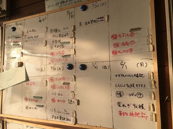 ホワイトボードにマグネットシートを貼って、直近10日間分の予定を見える化。天候などに合わせて、頻繁に優先順位を入れ替えている。(写真提供=萩原さん)