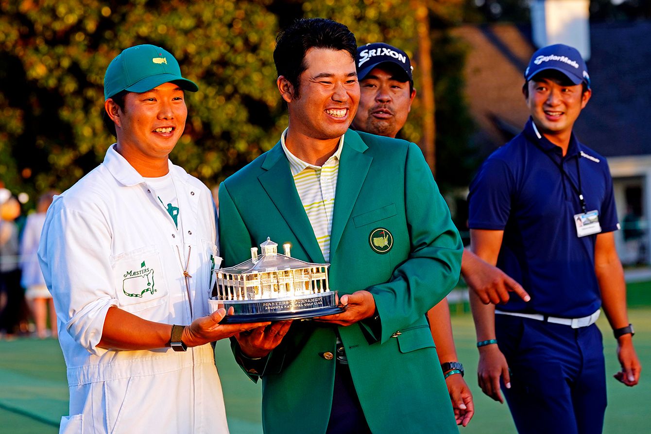 マスターズを制し、キャディーの早藤(左)と喜び合う松山英樹=2021年4月11日、オーガスタ