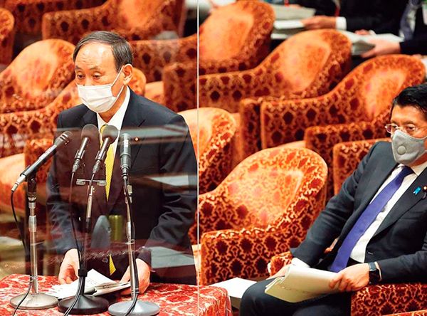衆議院内閣委員会で答弁する菅義偉首相(左)と平井卓也デジタル改革担当相(2021年3月31日)。(時事通信フォト=写真)