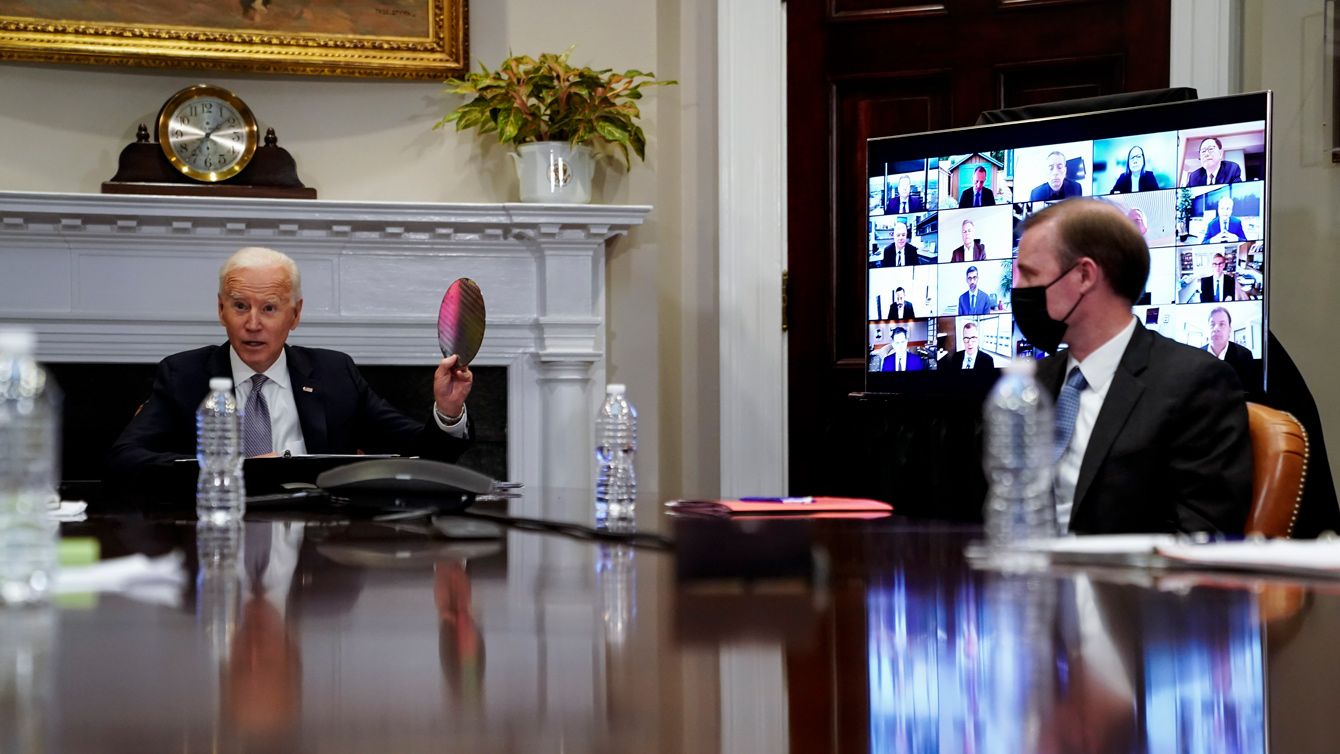 2021年4月12日、ホワイトハウスで、世界の半導体主要企業など19社の経営陣とのオンライン協議に臨むバイデン米大統領(左)=アメリカ・ワシントン