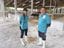 人工授精師・削蹄師の根間祐樹さん(写真右)と繁殖農家の塩川洋美さん。高齢農家の子牛の搬入や出荷を手伝うヘルパー組合員としてセリをサポートしている=4月19日、宮古家畜市場