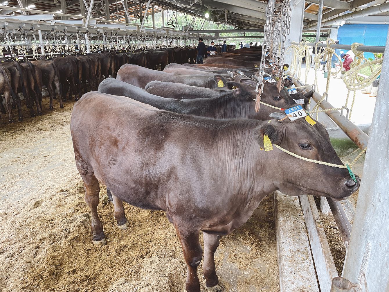 月1回開かれる子牛のセリ。全国各地の肥育農家が買い付けに参加する。昨年4月はコロナの影響で5年前の水準まで取引価格が下落していた。=4月19日、宮古島市・宮古家畜市場