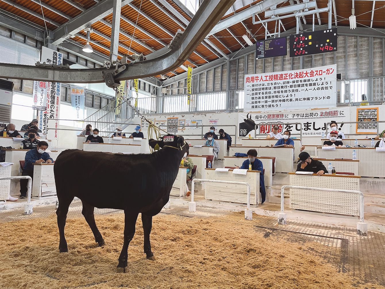 月1回開かれる子牛のセリ。全国各地の肥育農家が買い付けに参加する。昨年4月はコロナの影響で5年前の水準まで取引価格が下落していた。=4月19日、宮古島市・宮古家畜市場