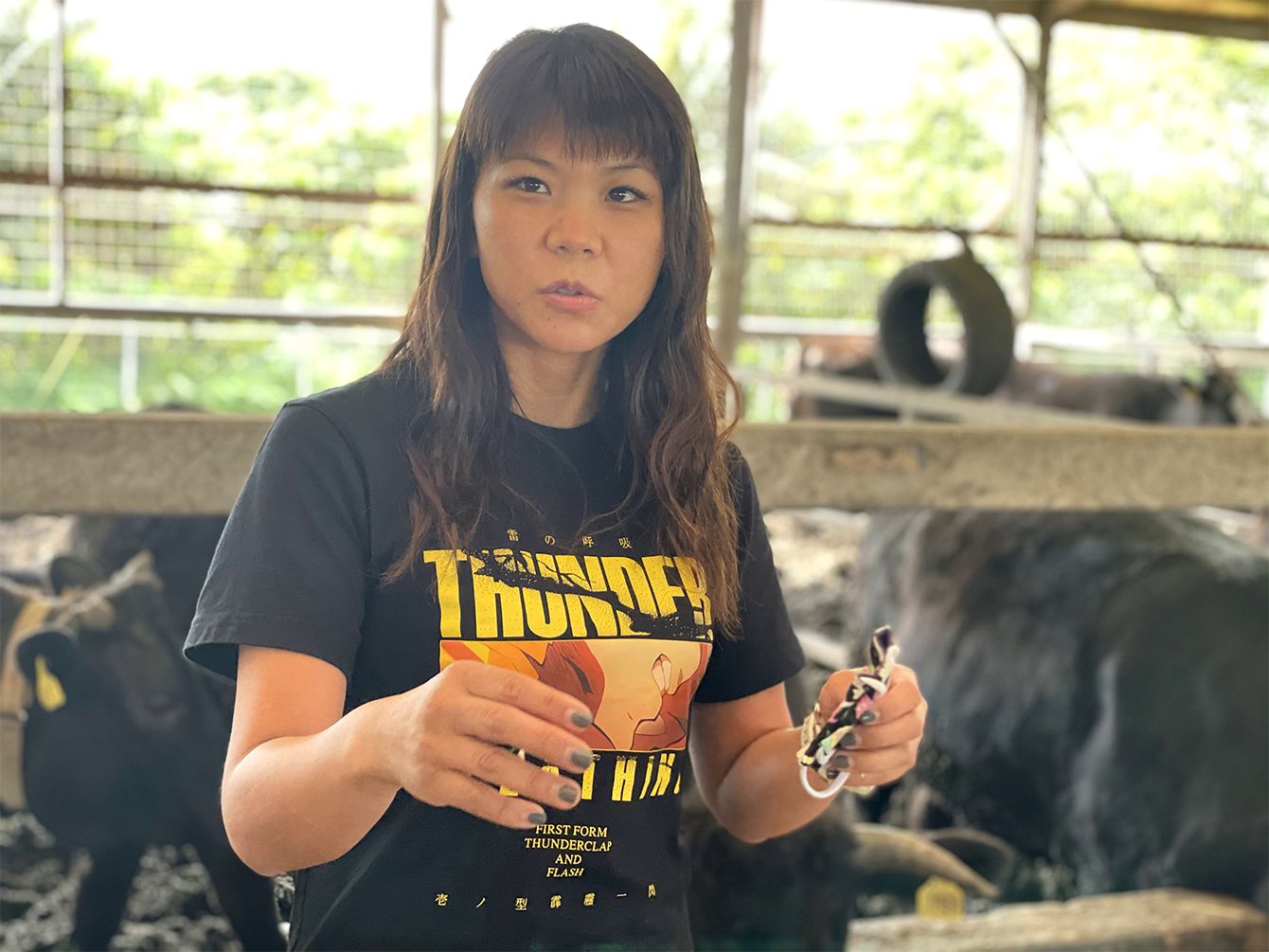 ゆいまーる牧場の金城美由紀さん。金城家の4姉妹の長女。石垣市内の高校の畜産科を出て、東京の大学で畜産を学び、23歳から牧場を取り仕切る=2月15日、石垣市・ゆいまーる牧場