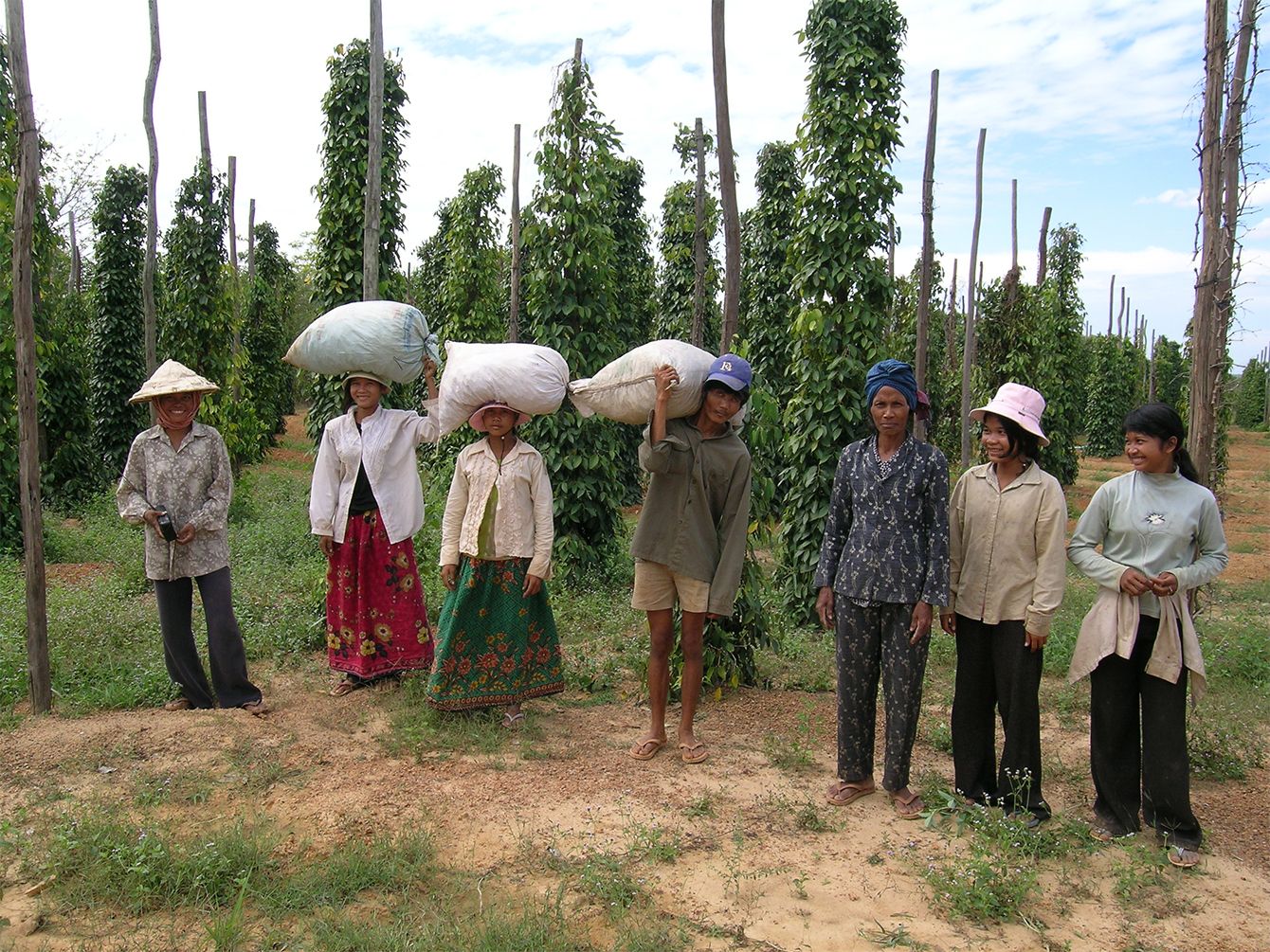 農園のスタッフ。みずみずしい葉を茂らせているのが胡椒。