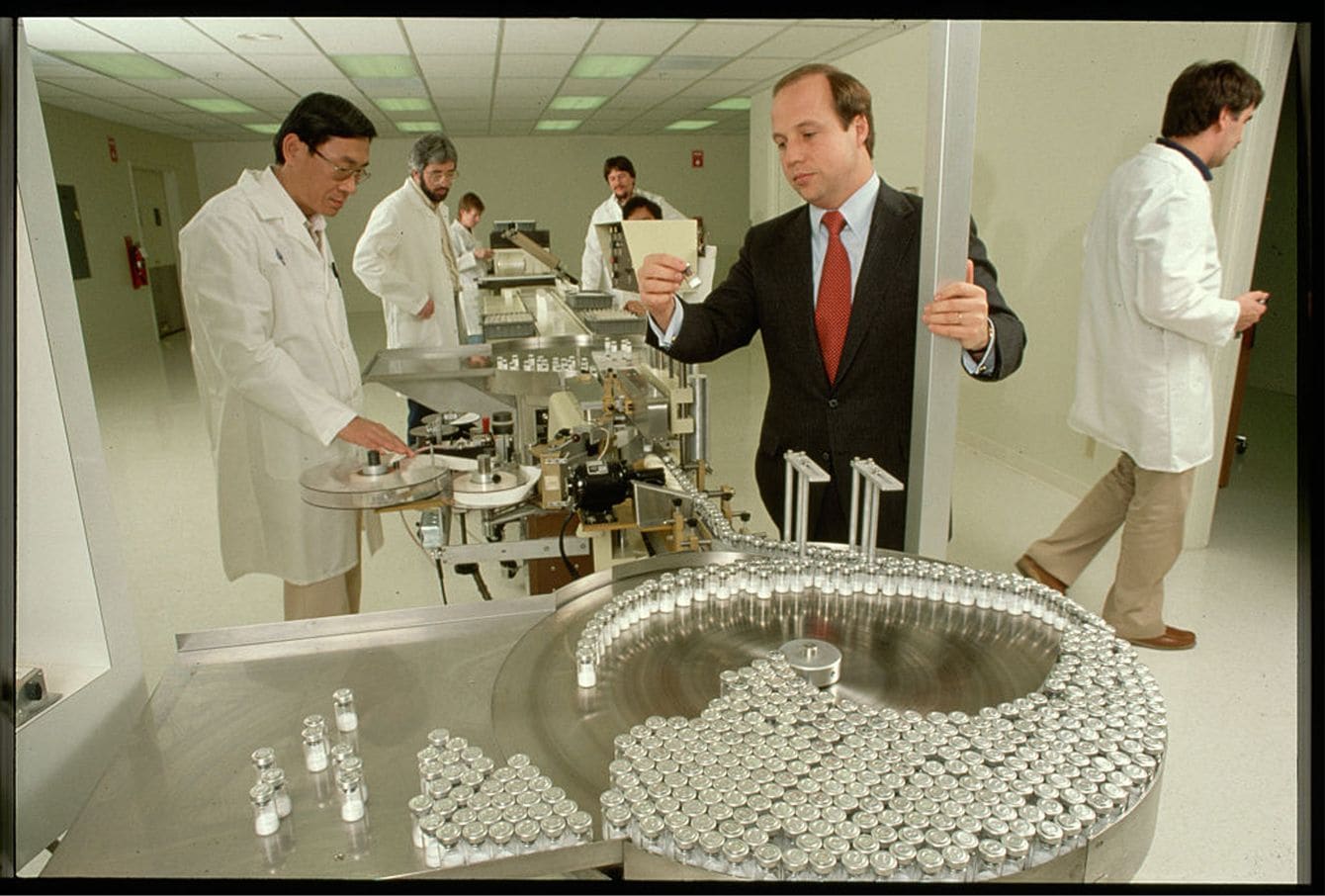 ジェネンテック社の研究室で撮影用のポーズを取るスワンソン(1984年)