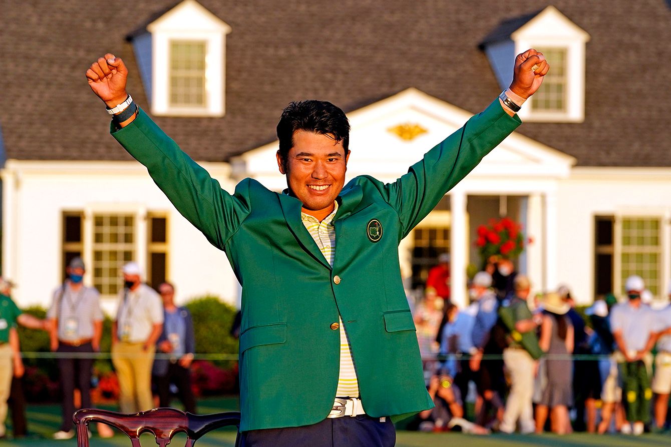 グリーンジャケットを着て喜ぶ松山英樹=2021年4月11日、オーガスタ