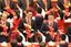 中国の改革開放40周年記念式典で表彰され笑顔を見せるアリババの馬雲会長(中段右)とテンセントの馬化騰会長(同中央)=2018年12月18日、北京の人民大会堂