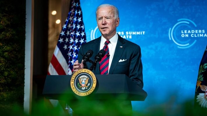 2021年4月22日、米国が主催する気候変動サミットにて、ホワイトハウスのイーストルームからスピーチを行うジョー・バイデン大統領