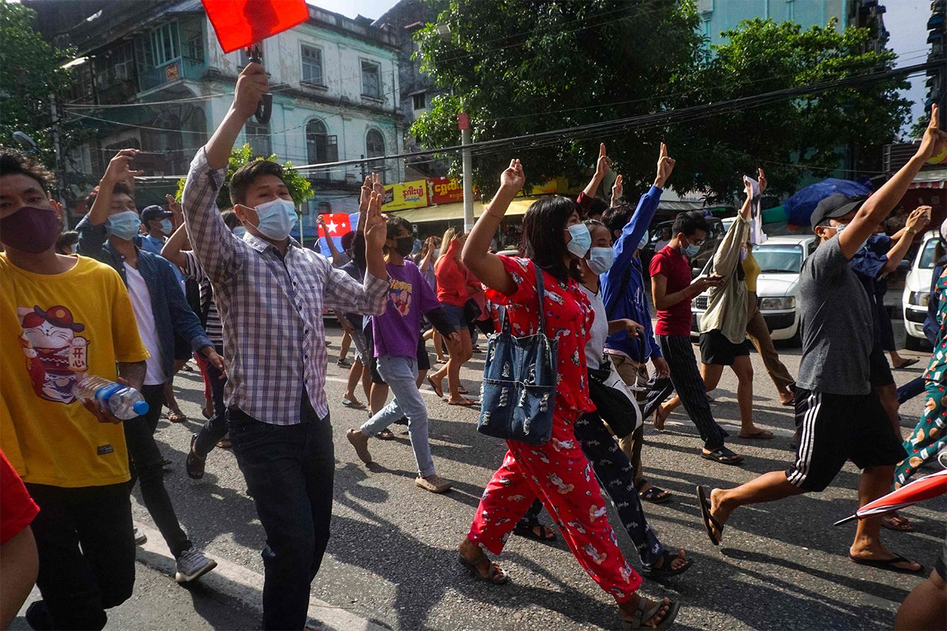 ヤンゴンのダウンタウンで行われた軍事クーデターに反対するデモで、3本指の敬礼をするデモ参加者たち=2021年5月6日