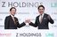 記者会見で撮影に応じる、Zホールディングス(HD)共同最高経営責任者(CEO)の川辺健太郎氏(左、ZHD社長)と出沢剛氏(LINE社長)=2021年3月1日、東京都港区