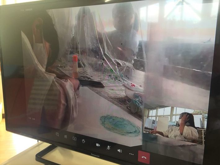 自宅と教室をつないだ図工の授業の様子。作業台の上にタブレットを置けば、クラスメートの隣にいる感覚で創作活動ができる。写真=狛江市立狛江第三小学校提供
