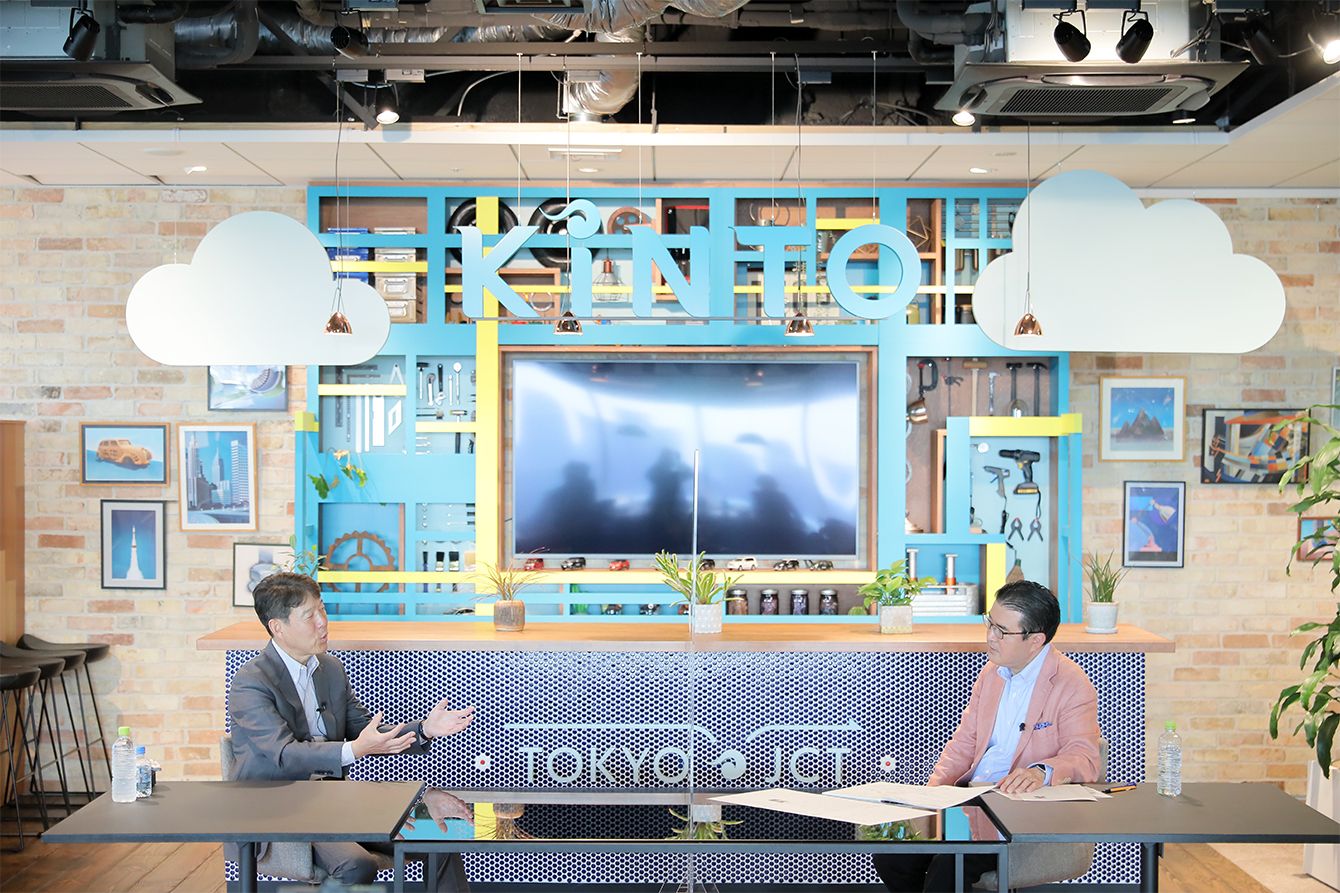 KINTOの小寺信也社長(左)と立教大学ビジネススクールの田中道昭教授(右)