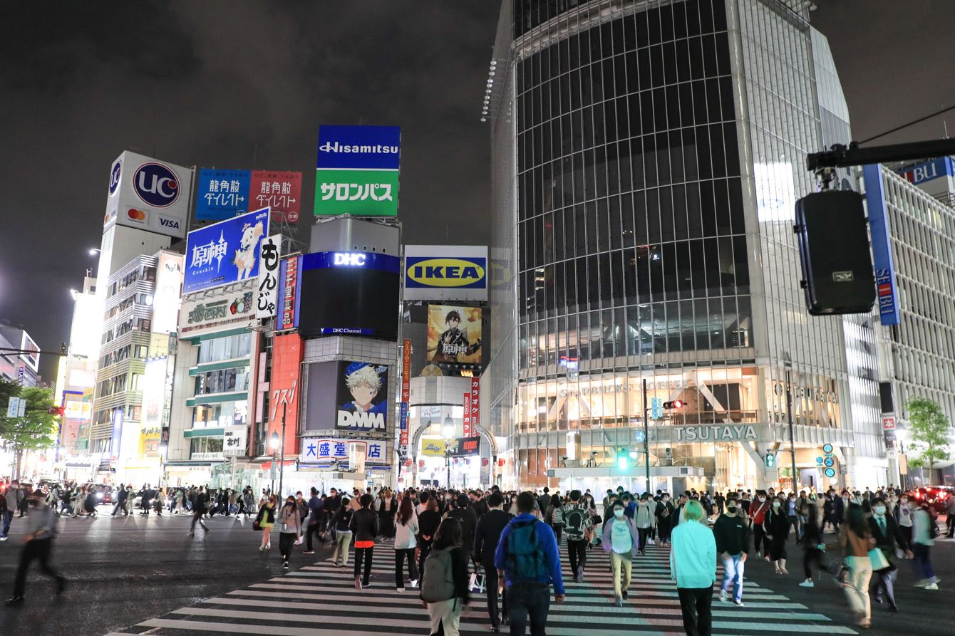 2021年5月12日、3回目の緊急事態宣言が延長された東京・渋谷のファッション街を、マスクをして歩く人々。