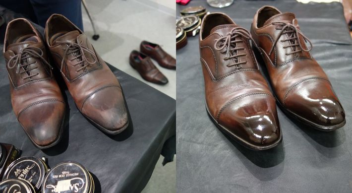 磨き終えた靴。鏡面磨きで靴に光沢が生まれている
