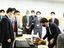 京セラ本社で山口会長(中央)の靴磨きをする濱岡さん(左)