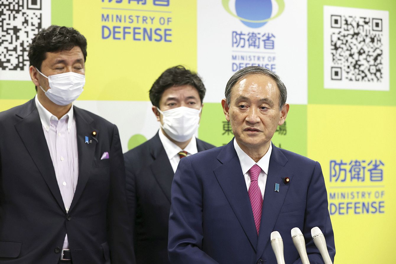 自衛隊が運営する大規模接種センターの視察を終え、記者の質問に答える菅義偉首相(手前)。奥左は岸信夫防衛相、同右は中山泰秀防衛副大臣=2021年5月24日、東京都千代田区の大手町合同庁舎3号館