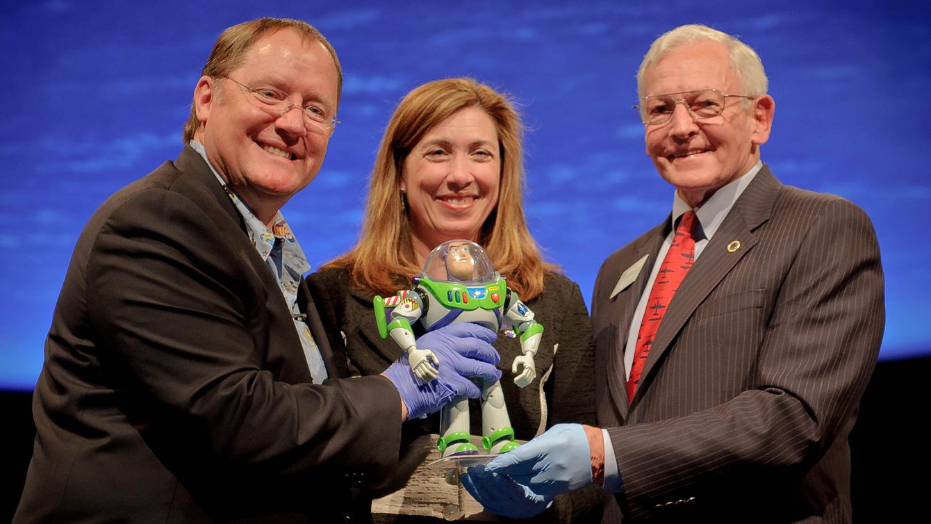 2012年3月29日、ワシントンのスミソニアン国立航空宇宙博物館のギャラリーで、映画『トイ・ストーリー』のジョン・ラセター監督(左)、ローリ・ガーバーNASA副長官、ジョン・デイリー(右)が映画のバズ・ライトイヤーを手にしている。