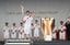 聖火リレーが中止となり、高岡スポーツコアで行われた点火セレモニーに参加したプロバスケットボール選手の宇都直輝さん(手前)ら=2021年6月2日、富山県高岡市
