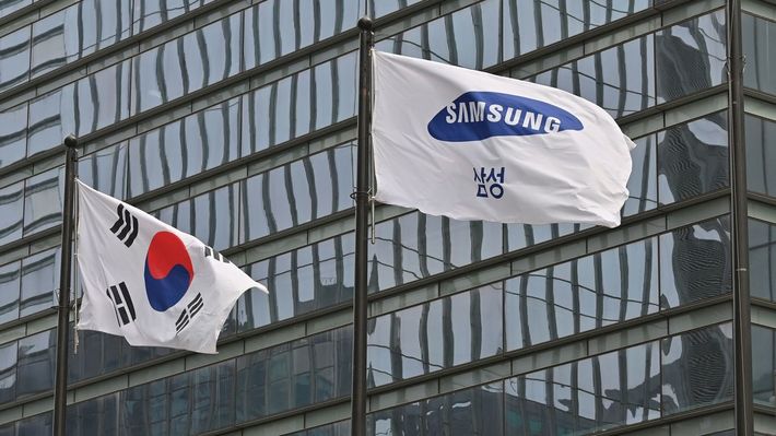 2021年4月28日、サムスンの旗(右)と韓国の国旗がはためく、ソウル市瑞草区のサムスン電子ビル