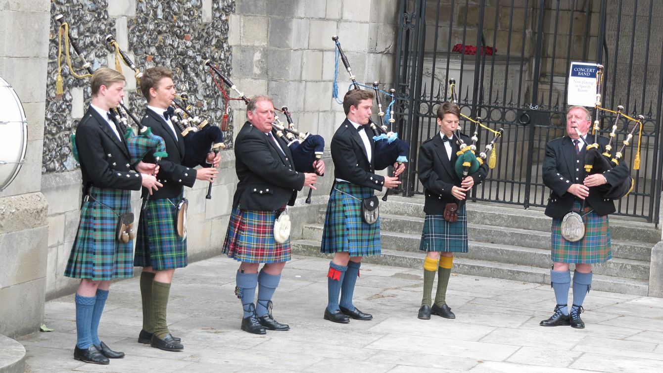 ハロウ校のスコットランド人生徒とOBによるバグパイプバンド。家ごとに代々伝わるチェック柄を着る。