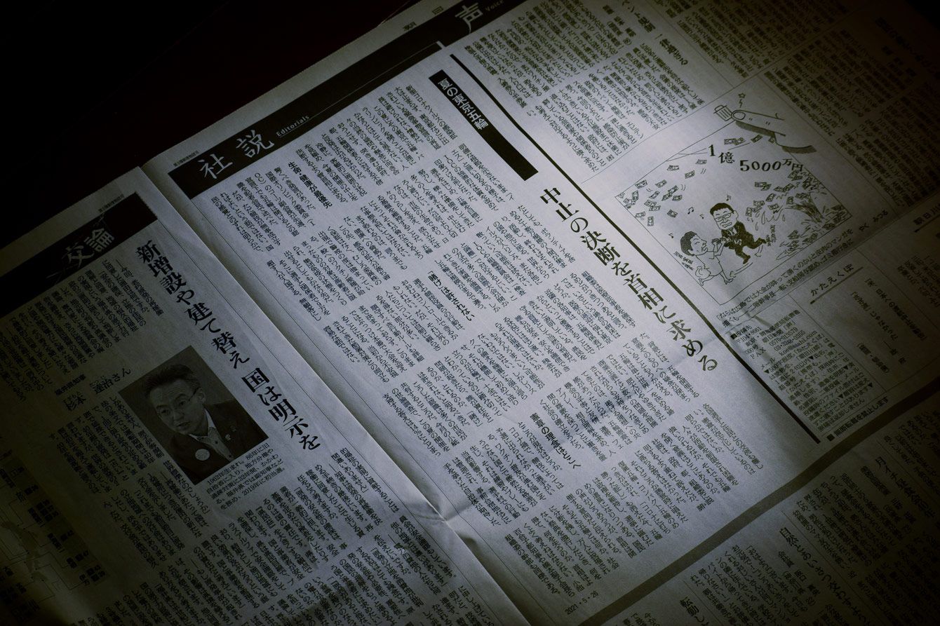 東京五輪中止の決断を首相に求める朝日新聞5月26日付朝刊の社説=2021年5月26日、東京都中央区