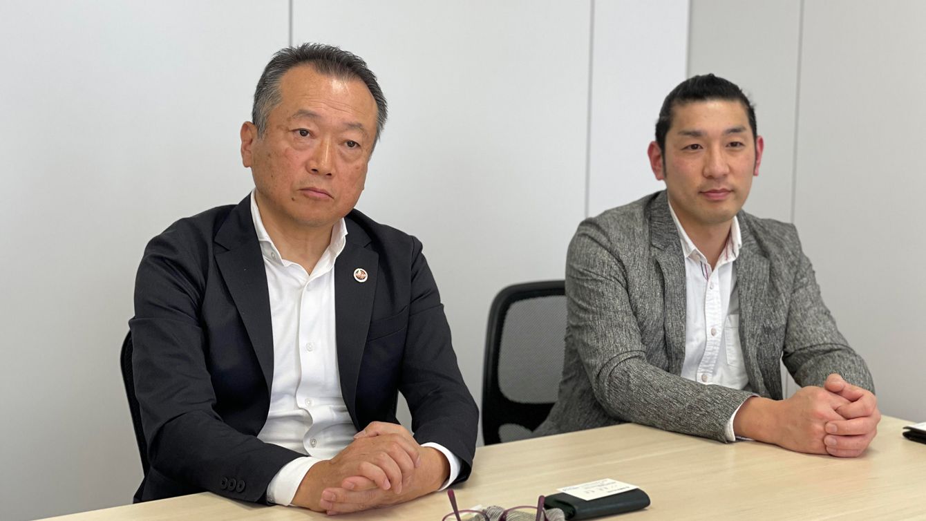 開業に向け新聞社のインタビューに応える石川マサヨシ氏(右)と、新事業への投資を決めた金井孟氏=2021年2月、那覇市・沖縄タイムス