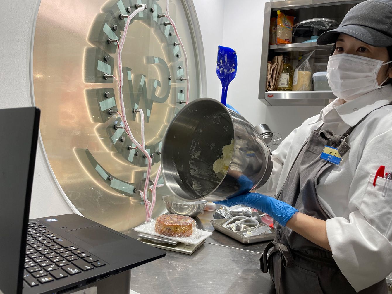 大阪の石川シェフと沖縄の厨房をZoomでつないで新商品の試作をするパティシエの大工真理枝さん=6月9日、那覇市久茂地・GOLDWELL