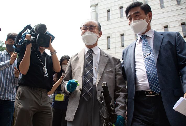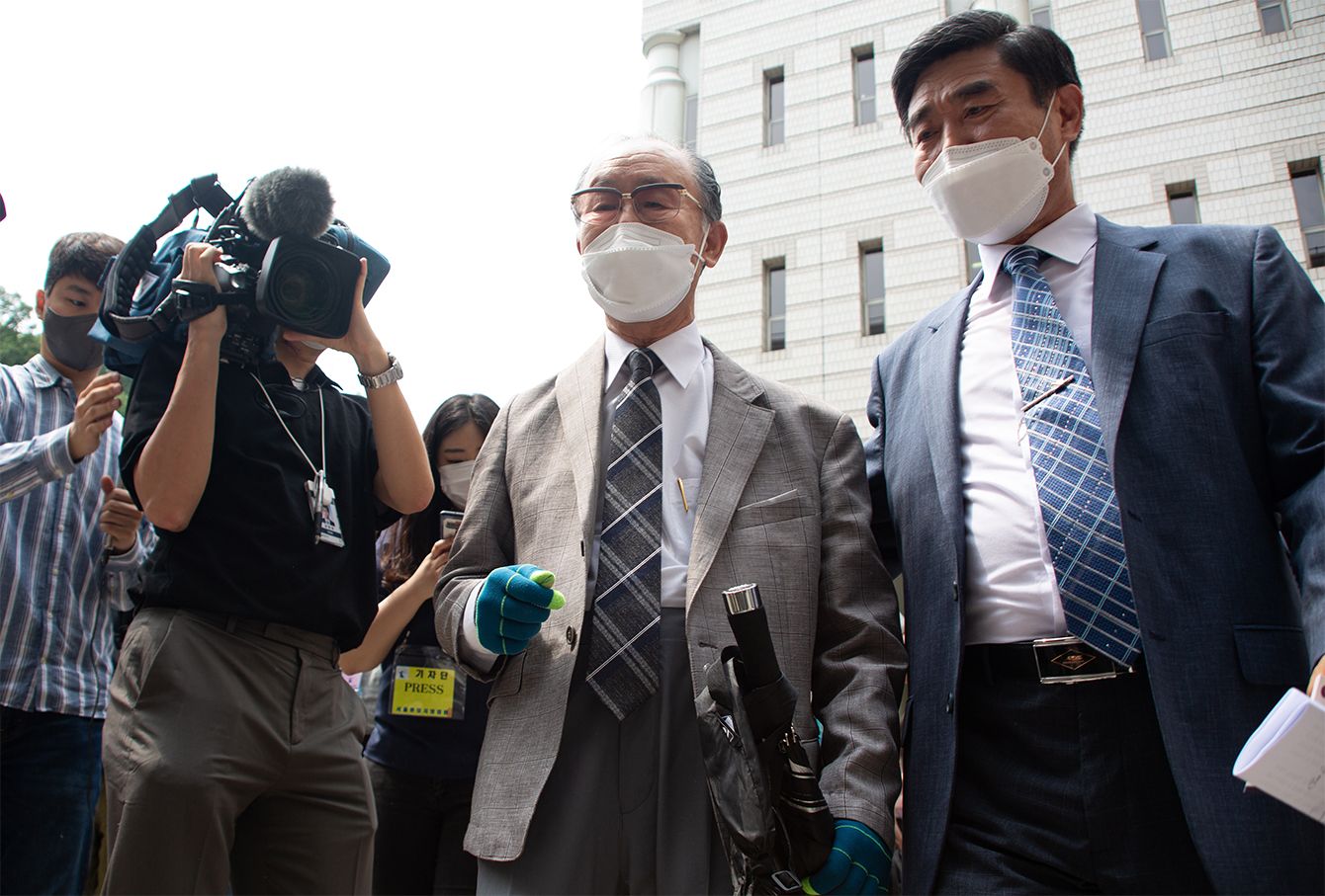 2021年6月7日、韓国・ソウルのソウル中央地裁で行われた判決を受け、取材に応じる元徴用工イム・ジョンギュ氏の息子ら