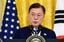 ホワイトハウスのイーストルームで、記者会見に臨む韓国の文在寅大統領(=2021年5月21日、アメリカ・ワシントンD.C.)