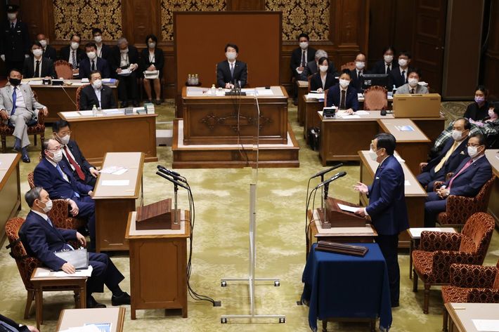 党首討論で菅義偉首相(左端)に質問する立憲民主党の枝野幸男代表(中央右)=2021年6月9日午後、国会内