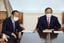 自民党役員会に臨む菅義偉首相(右)と二階俊博幹事長=2021年5月24日、国会内