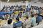 東京電力福島第一原子力発電所の大型休憩所の食堂で食事する東電と協力企業の社員ら=2015年6月1日、福島県大熊町[代表撮影]
