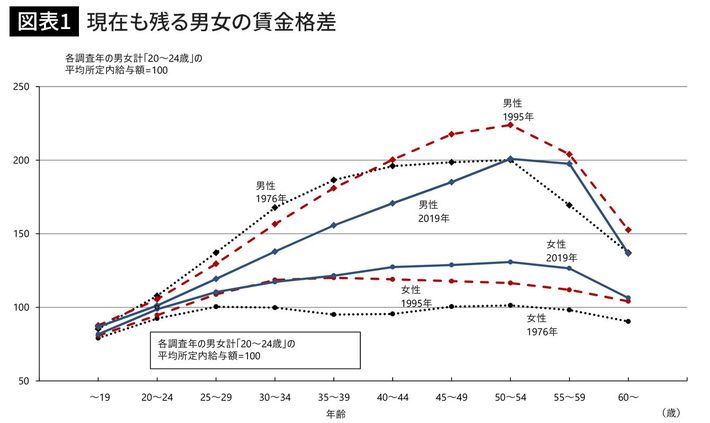 資料出所=厚生労働省「賃金構造基本統計調査」を元に労働政策研究・研修機構が作成。性別、年齢階級による賃金カーブ[1976年、1995年、2019年](一般労働者、所定内給与額)