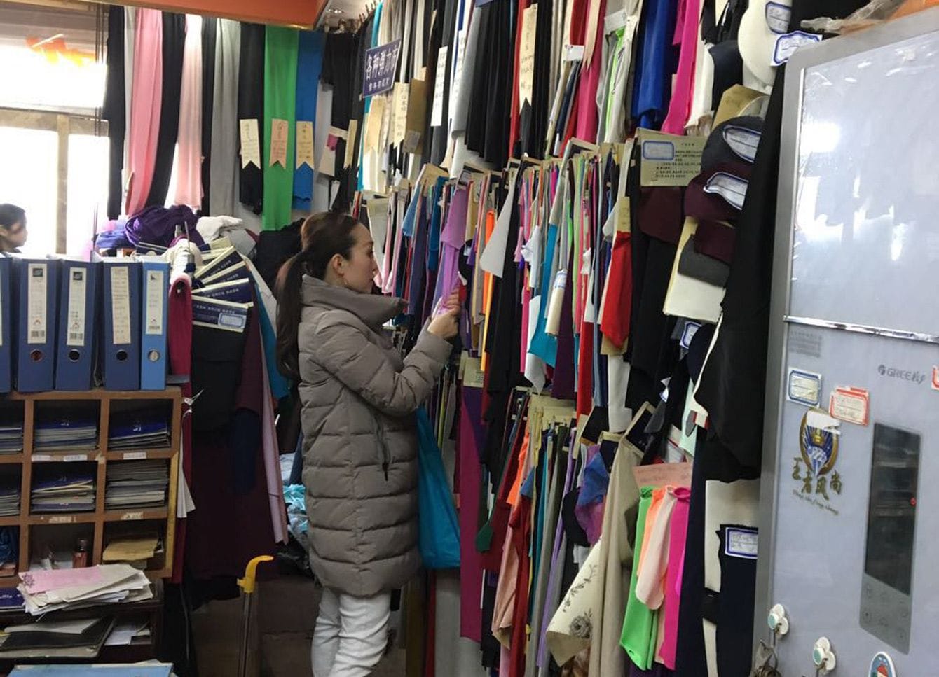 北京で生地を選ぶ中川さん