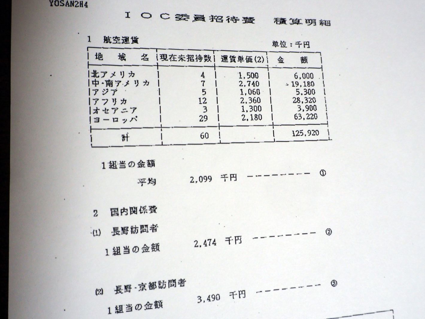 「長野県」調査委員会の報告書から。「IOC委員招待費」には長野訪問後に京都観光を含めた予算があった