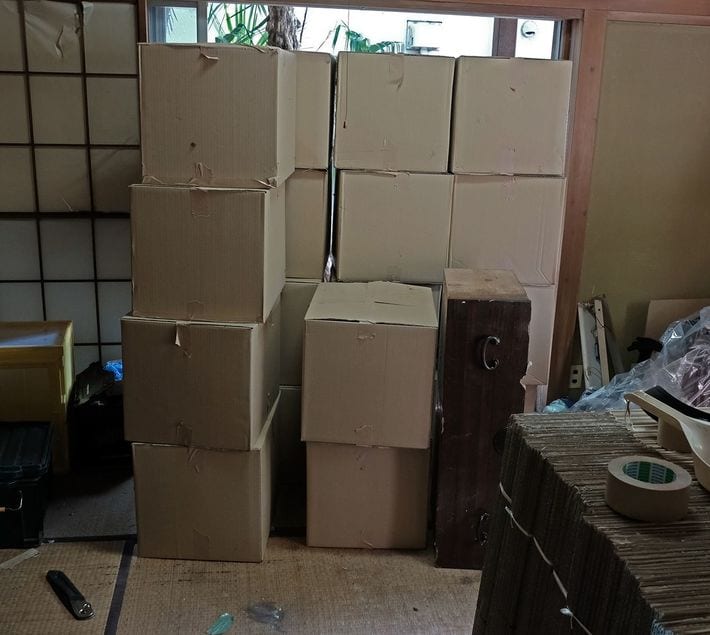 ゴミは段ボールに収容し、外で待つトラックへ運び出す。