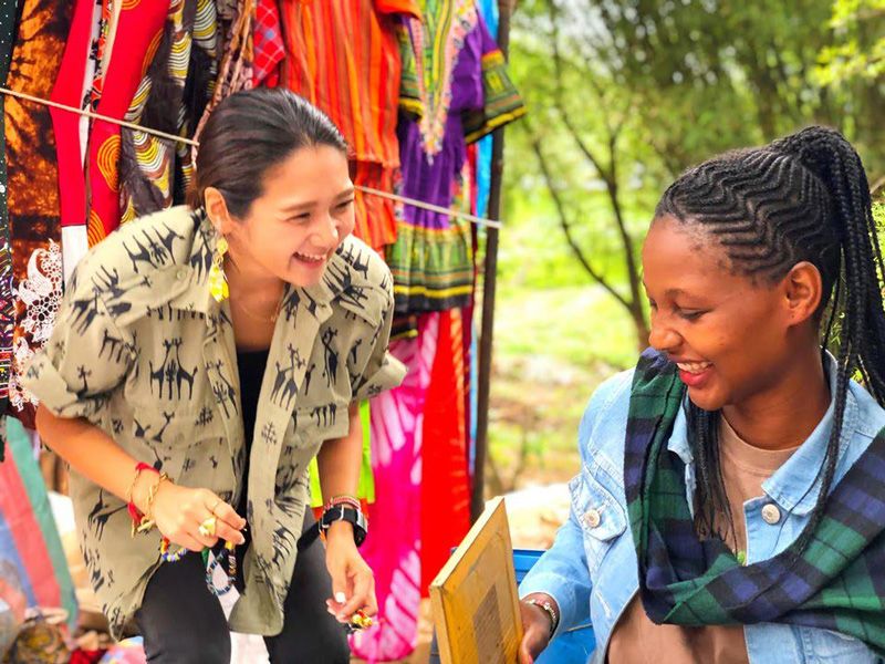 河野リエさん(右)。2019年4月ごろナイロビのマサイマーケットで。当時アフリカ布ピアスを製作してくれていたドロシーさんと
